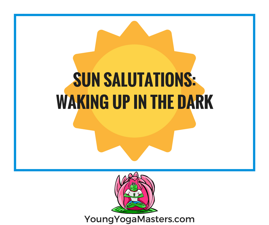 - Sun Salutation: Well this was my pick. I led off with sun salutations, which we had been learning all summer. Both the daycare teacher and I were impressed at how well the kids were getting to know them by heart.Also, kids will launch into yoga poses sometimes without warming up. Often it doesn’t matter too much for the active kids who are always warmed up. But you have to think of the whole class. If you are letting the kids choose the poses make sure they are warmed up first, or ask if any favorites are warm-up poses. It’s also a good way to review the idea of warming up.