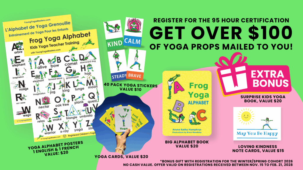 Get new ideas and techniques to teach yoga to children. Your kids’ yoga questions will be answered with Lead Trainer, Aruna, who has been teaching yoga for over 25 years!
